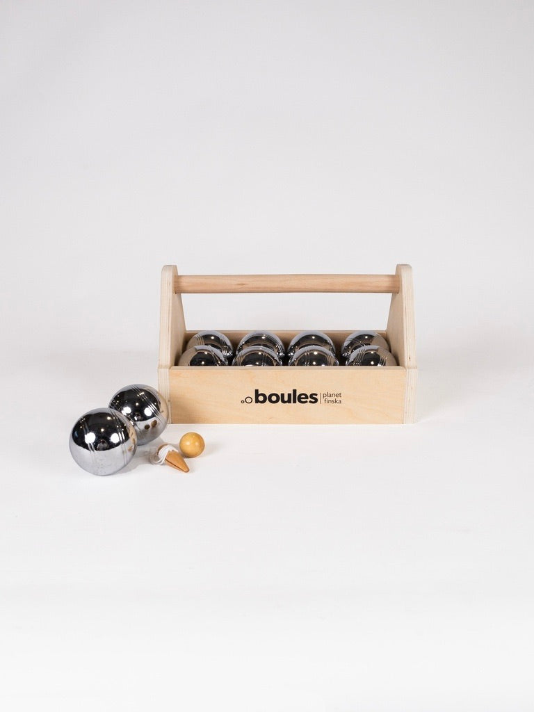 Planet Finskas premium set of eight boules comes in its own stylish linden ply carry crate finished in a clear varnish to seal and protect.