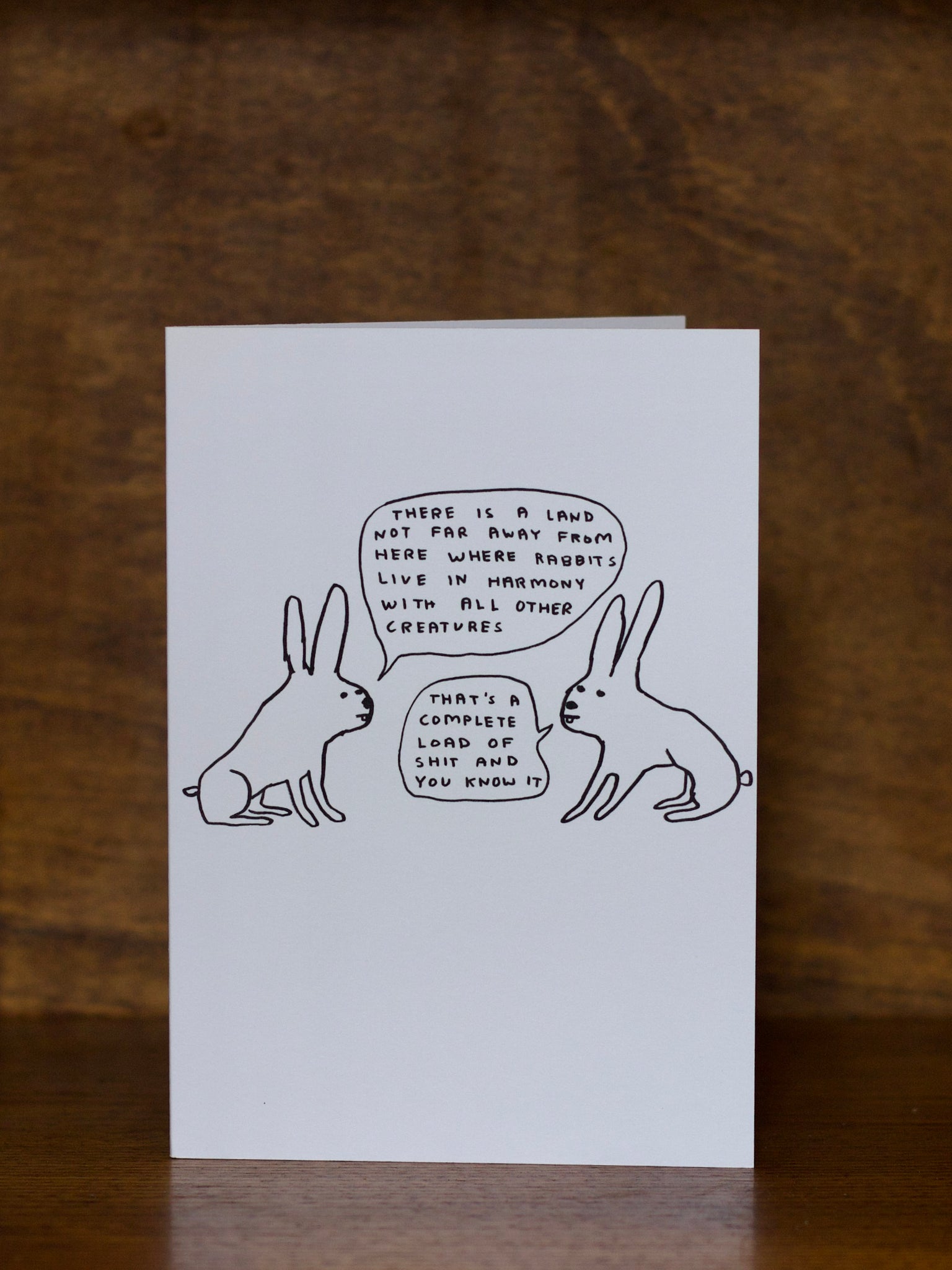 All occasions greeting card with rabbit illustration and text on a wooden surface