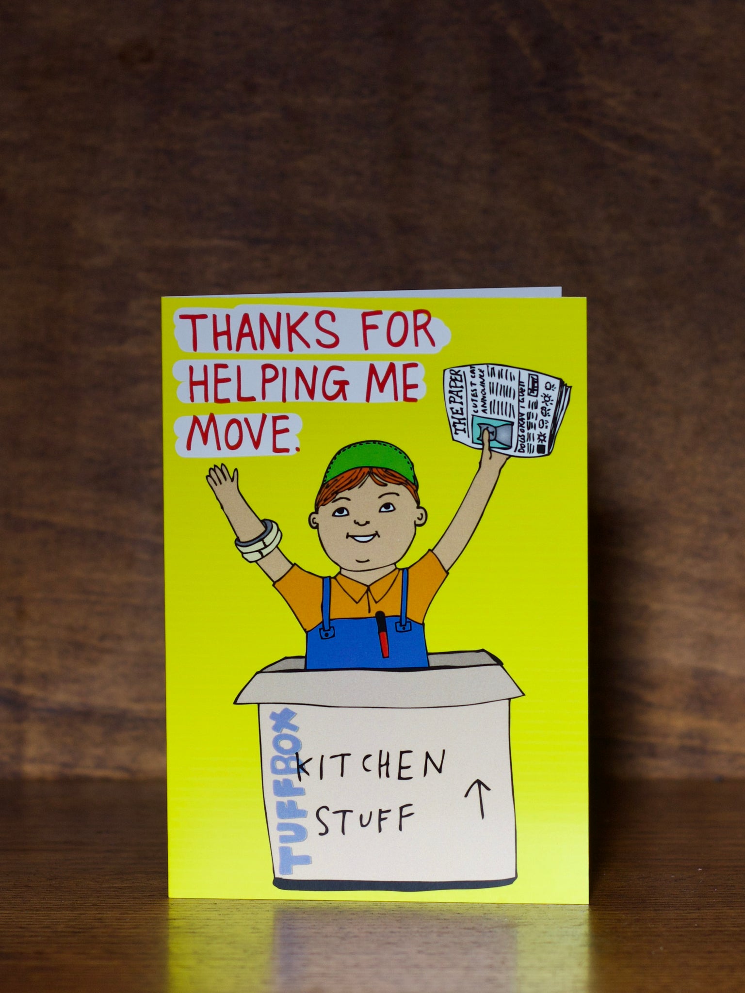 Thank You Greeting Cards with illustration of a person in a box labeled 'Kitchen Stuff' and text 'Thanks for helping me move.' on a wooden surface.